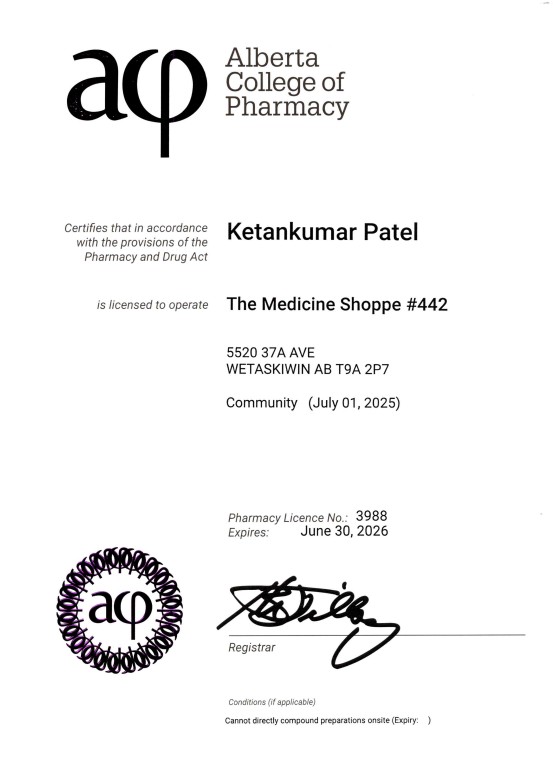 Ketankumar Patel Pharmacy License No.: 3988 Community: July 1,2025 Expires: June 30, 2026