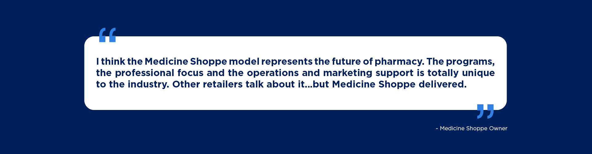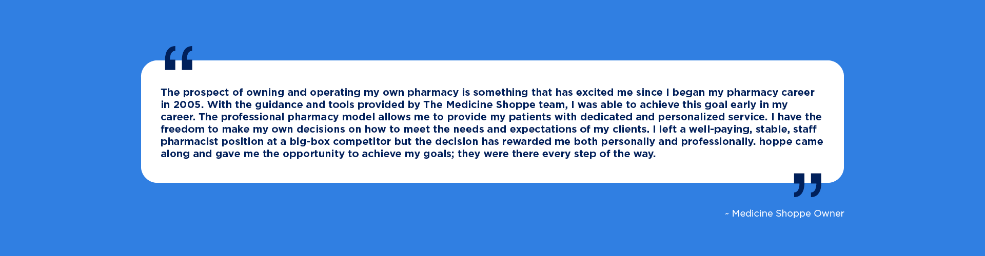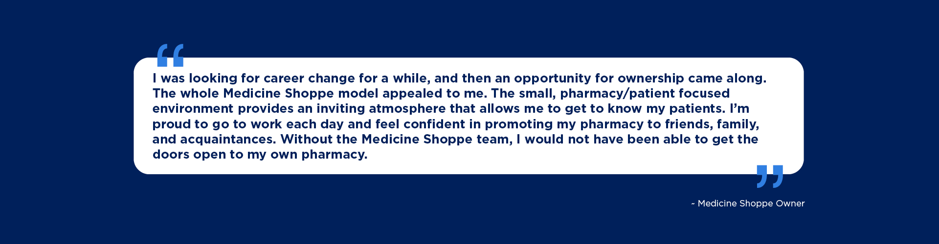When you join The Medicine Shoppe, you gain more than a business—you gain a proven model backed by high-performing systems, national brand recognition, and continuous support. You’ll be empowered to build a thriving pharmacy practice with confidence. Deliver exceptional care. Achieve your entrepreneurial goals as a pharmacy owner. Make a lasting impact in your community.