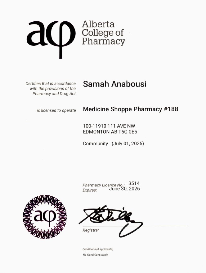 Les services pharmaceutiques présentés dans cette section sont offerts par les pharmaciens propriétaires affiliés à Medicine Shoppe. Les pharmaciens sont les seuls responsables des activités professionnelles pratiquées dans le cadre de l’exercice de la pharmacie.